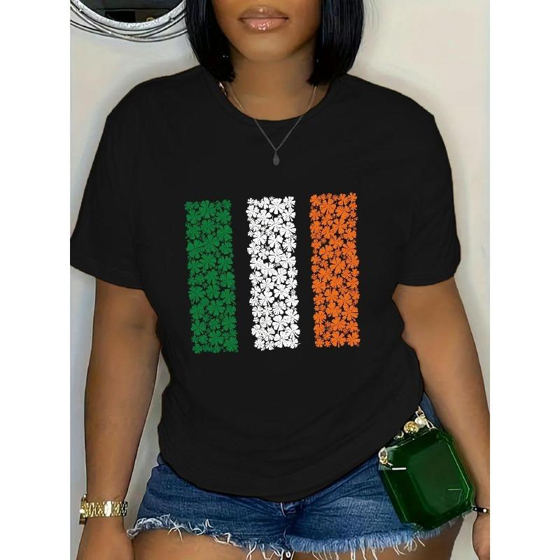 Women Plus Size Irish Flag T-Shirt Black Green White Orange St Patrick's Day Round Neck Short Sleeve Casual Festive Machine Washable Top