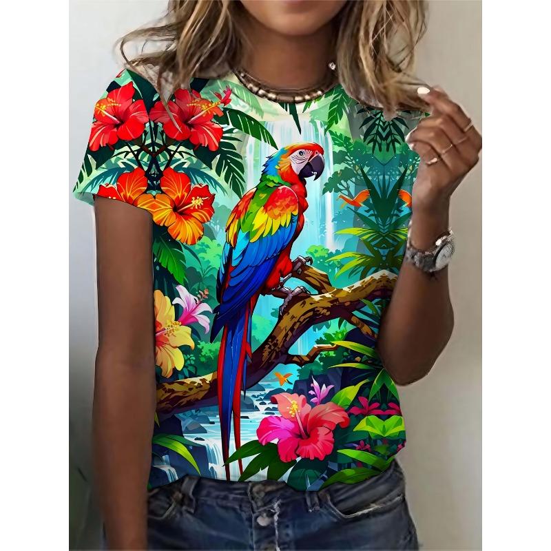 Summer Parrot Print T-Shirt for Women Crew Neck Casual Top Breathable & Machine Washable