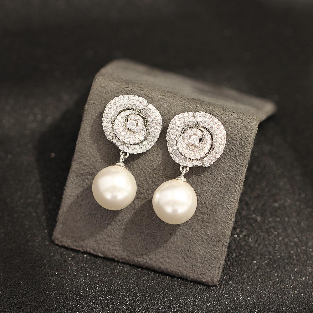 New product temperament: diamond-inlaid white rose stud earrings, simple and versatile, imitation pearl earrings, 925 silver needle earrings, earrings