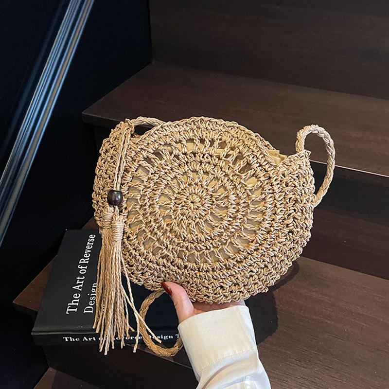 Women Hollow Straw Bag Circle Rattan Bag Round Soft Paper Rope Shoulder MessengerBag Tassel Summer Beach Handmade Crossbody Bags