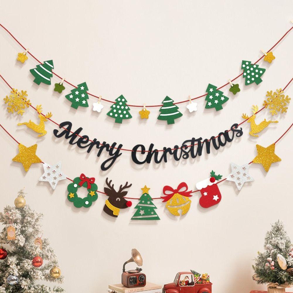 Felt Christmas Banner Red Green Elk Design Xmas Pull Flag Hanging Ornament Santa Design Hanging Bunting Christmas Party