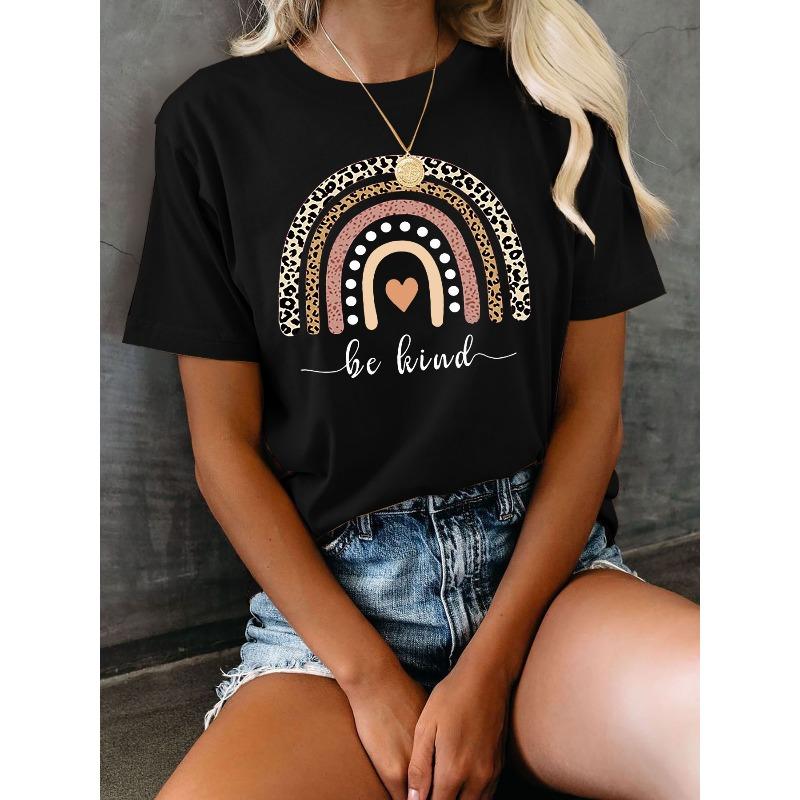 Women Be Kind Letter Leopard Print T-Shirt Round Neck Short Sleeve Casual Top