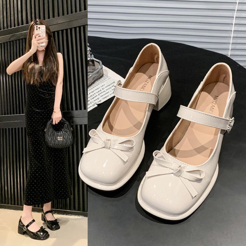 Bow square head small leather shoes women's one-word buckle skirt beige Mary Jane medium heel single shoes