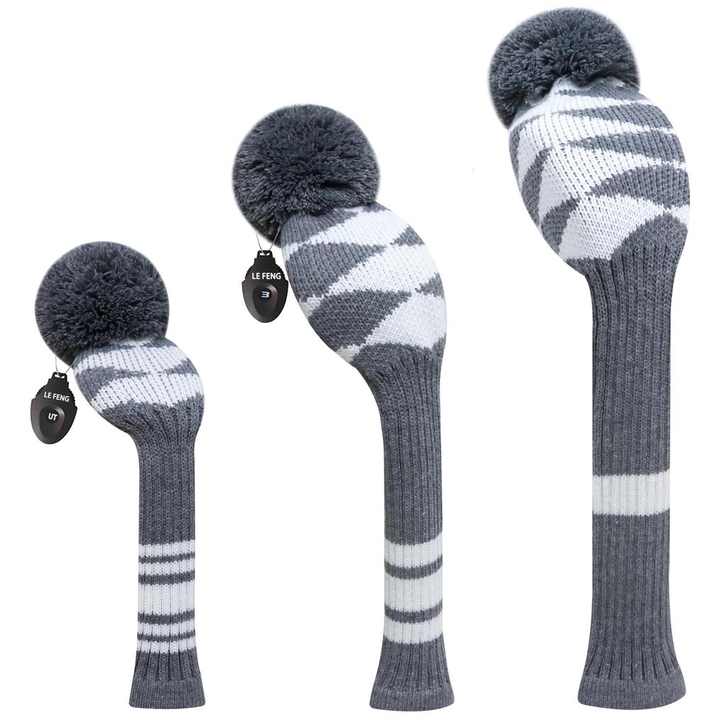 LeFeng Sports Knit Golf Club Cover Set with Number Tags and Fits and 5 Woods Check 3-Piece Pompoms, Gray, 1, 3, (Gray Pattern)