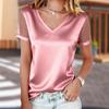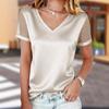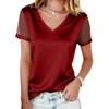 Women's Satin V Neck T-shirt Mesh Short Sleeve with Rhinestone Detail Casual Elegant Solid Color Top