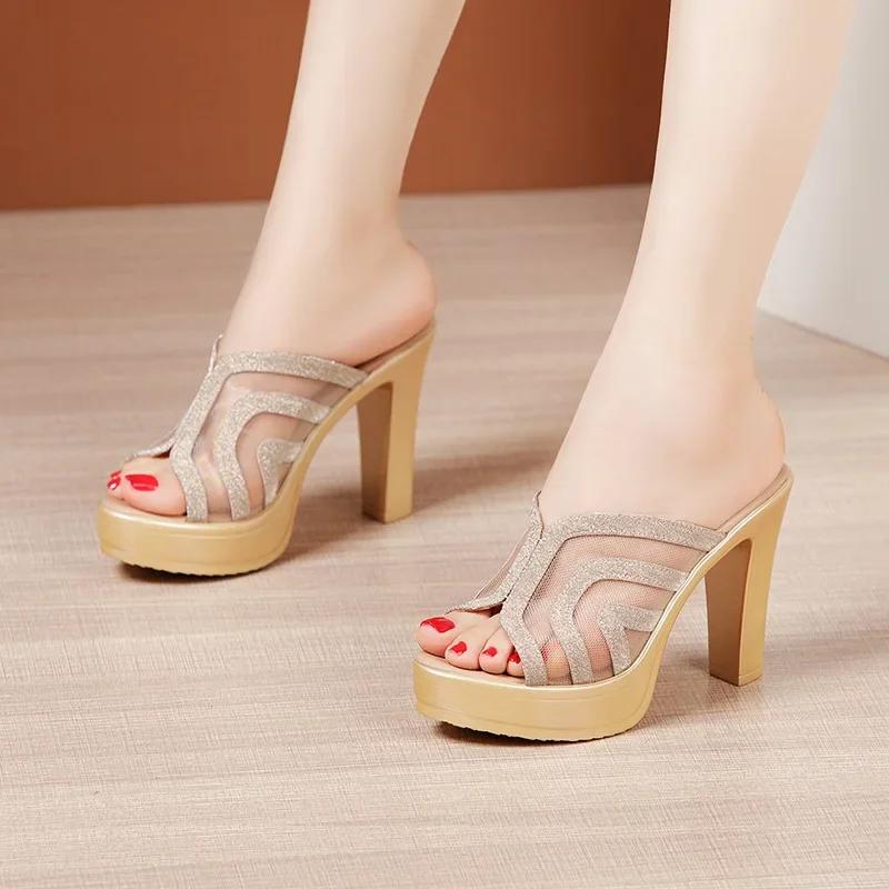10cm Small Size 32-43 Fashion Glitter Mesh Leather Slippers Summer Shoes 2025 Block High Heels Slides Platform for Office Party