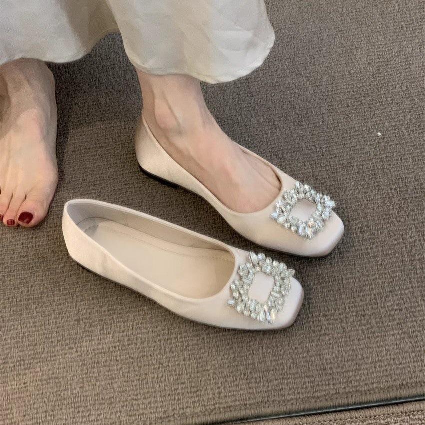 Gentle fairy wind single shoes French evening wind temperament square buckle rhinestone shallow mouth flat bottom commuting shoes