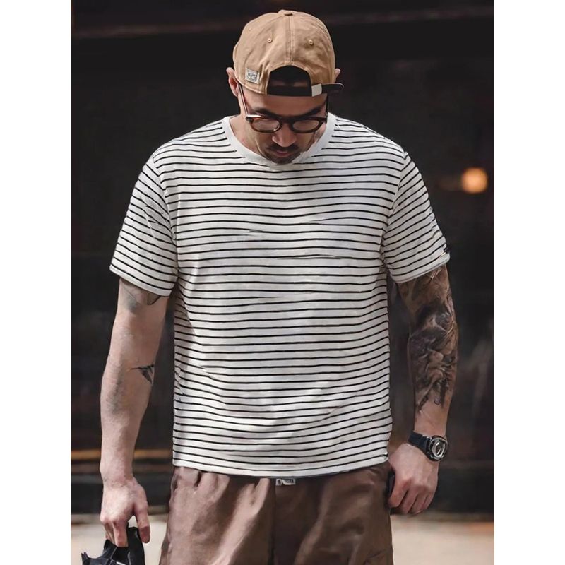2025 New American vintage round Neck Knitted Stripes Short sleeve T-shirt Men's Summer Bottoming Shirt Foreign Trade Men's T-shirt