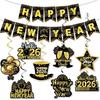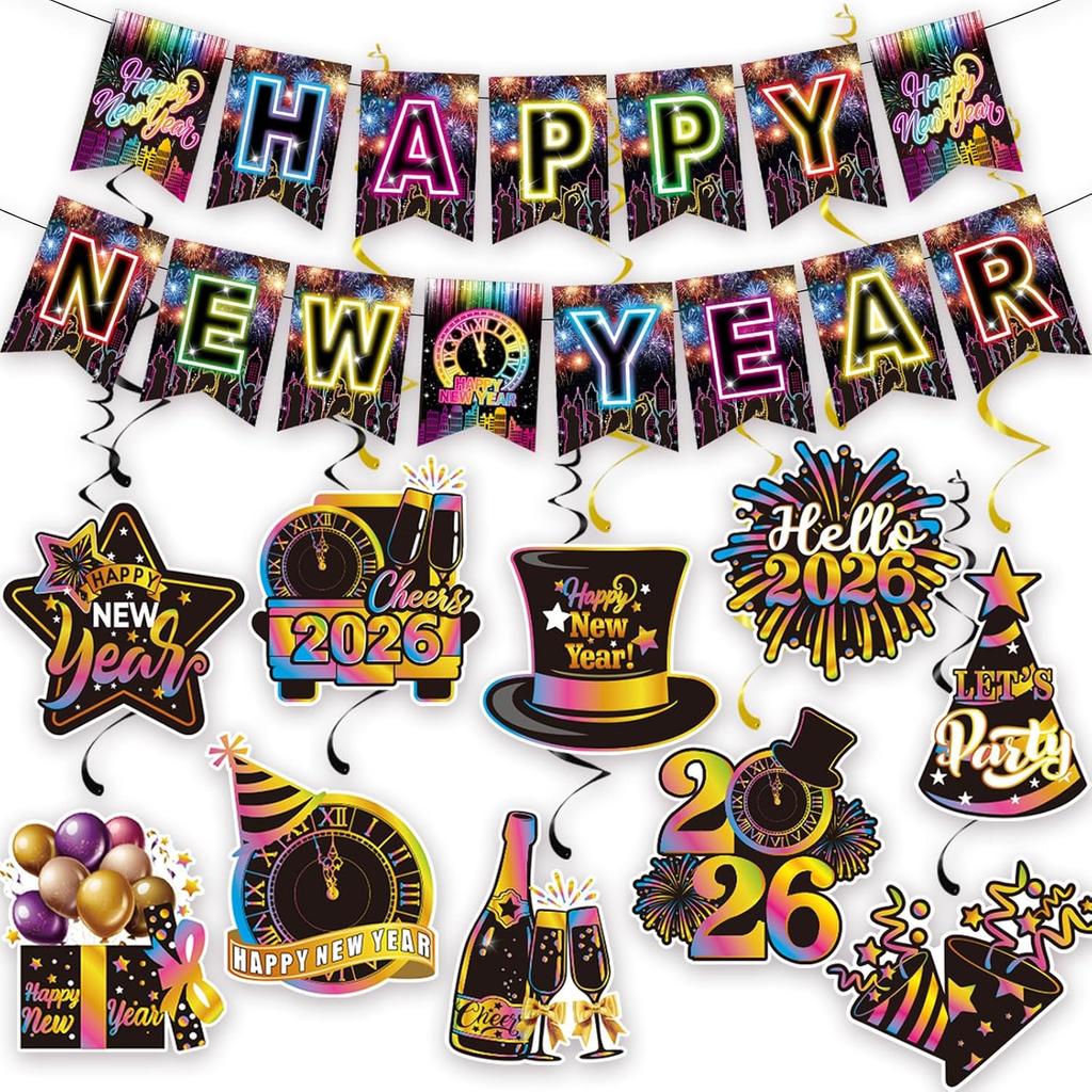 Colorful Happy New Year Banner & Hanging Swirls, Neon Themed 2026 Happy New Years Paper Banner Ceiling Swirl Streamers for New Years Eve Party