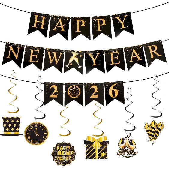 Yookat Black Gold Happy New Year Banner and New Years Hanging Swirls 2026 Happy New Years Eve Party Decorations Supplies