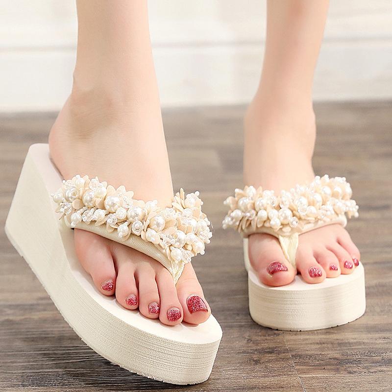 Women's Flip Flops Fashion Wedges Platform Sandalias Luxury Pearl Decor Women's Slippers Outdoor Casual Beach Slippers for Women