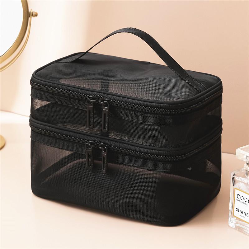 Double-Layer Nylon Mesh Travel Cosmetic Bag - Large Capacity, Transparent, Handheld Toiletry Organizer