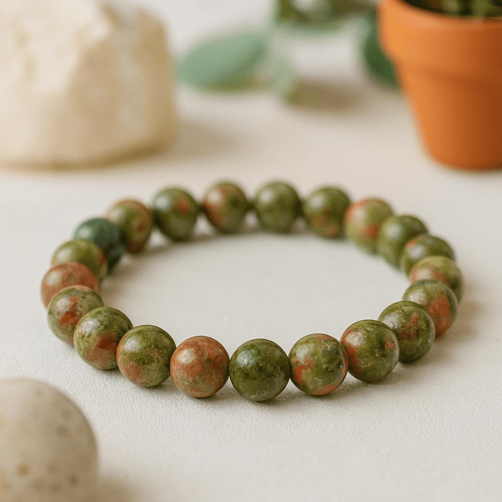 Cool, glossy beads rest smoothly against the skin — a quiet circle of green jasper with marbling in fern and moss tones, gentle blush notes, and occasional charcoal speckles. Each bead catches the light with a soft sheen, inviting a calm, grounded presence. 🌿