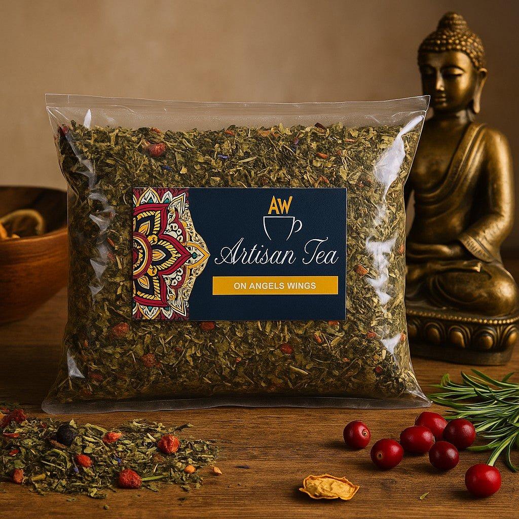 The kettle hums, steam curling like soft feathers in the afternoon light. In the palm, the loose blend is a little constellation — leaf flakes and dark shards, ringed red fruit, and petals in violet and gold. It looks alive, as if caught mid-flight. 🕊️