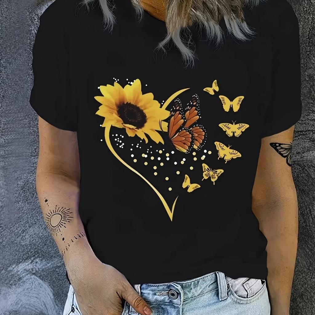 Butterfly Sunflower Heart Design Print Women Short Sleeve Women's Casual Crew Neck T-Shirt Women Clothes