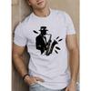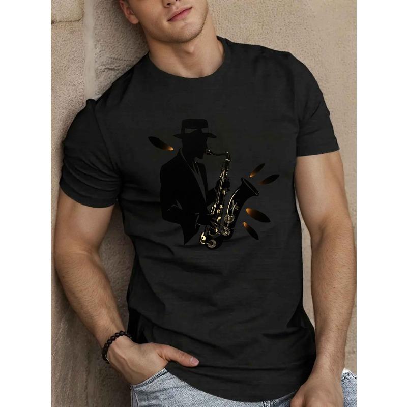 European Size Men'S Casual Polyester T-Shirt with Geometric Saxophone Silhouette - Round Neck, Short Sleeve, Summer Top for Adults