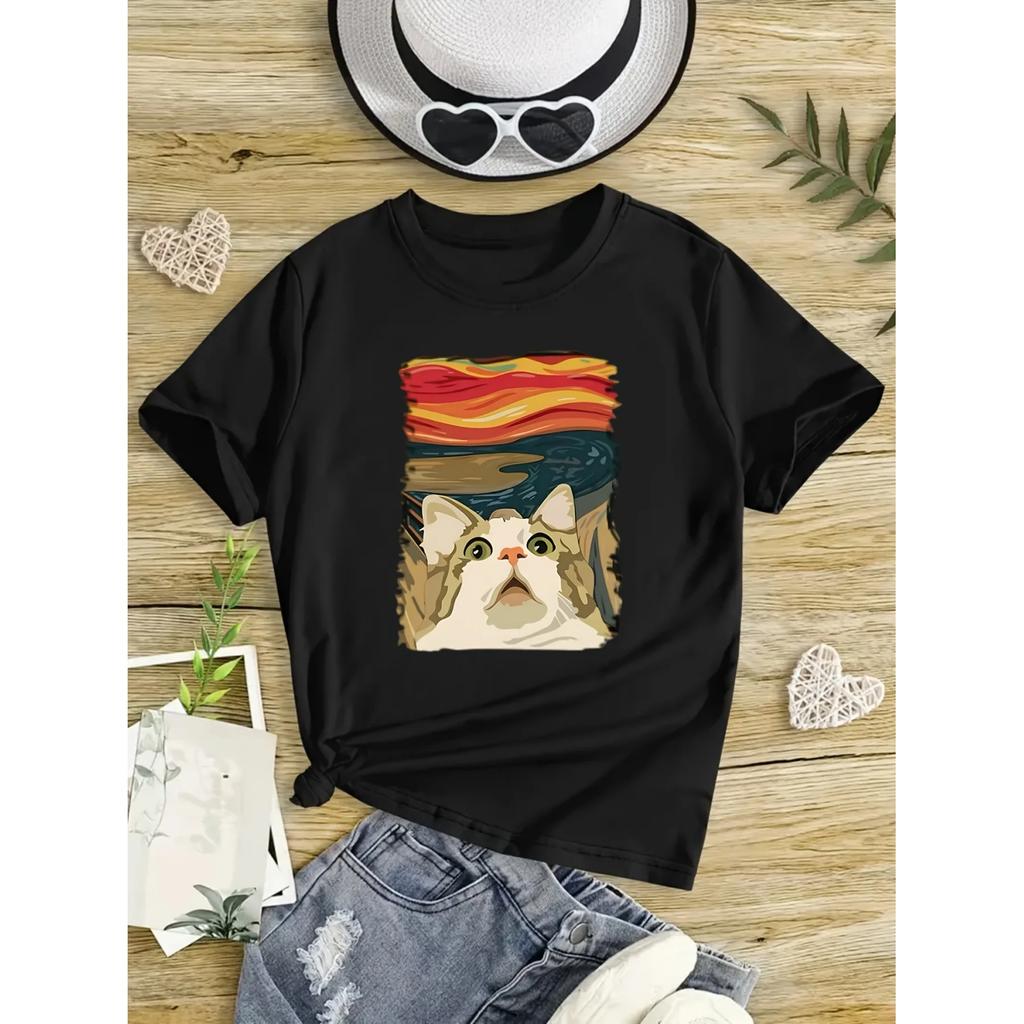 Cute cat print short-sleeved T-shirt casual and versatile style suitable for daily wear and going out in summer
