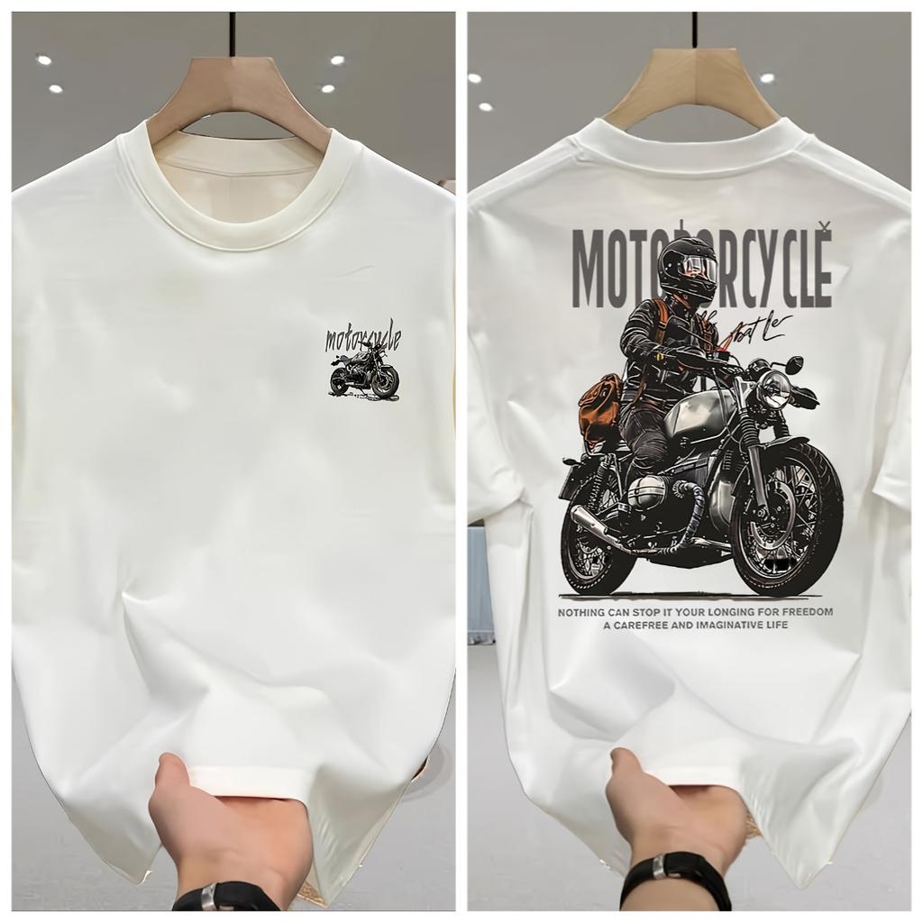 Mens Heavyweight 100 Pure Cotton Retro Motorcycle Pattern Tshirt Breathable Round Neck Short Sleeved Casual Summer Tshirt