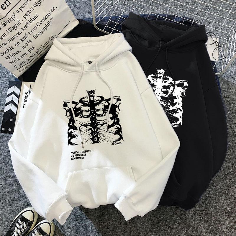 Hoodie Pocket Long Sleeve Streetwear Black Tops Skeleton Print Grunge Gothic Oversized Men Women Hoodie Streetwear Women's Men's Sweatshirt