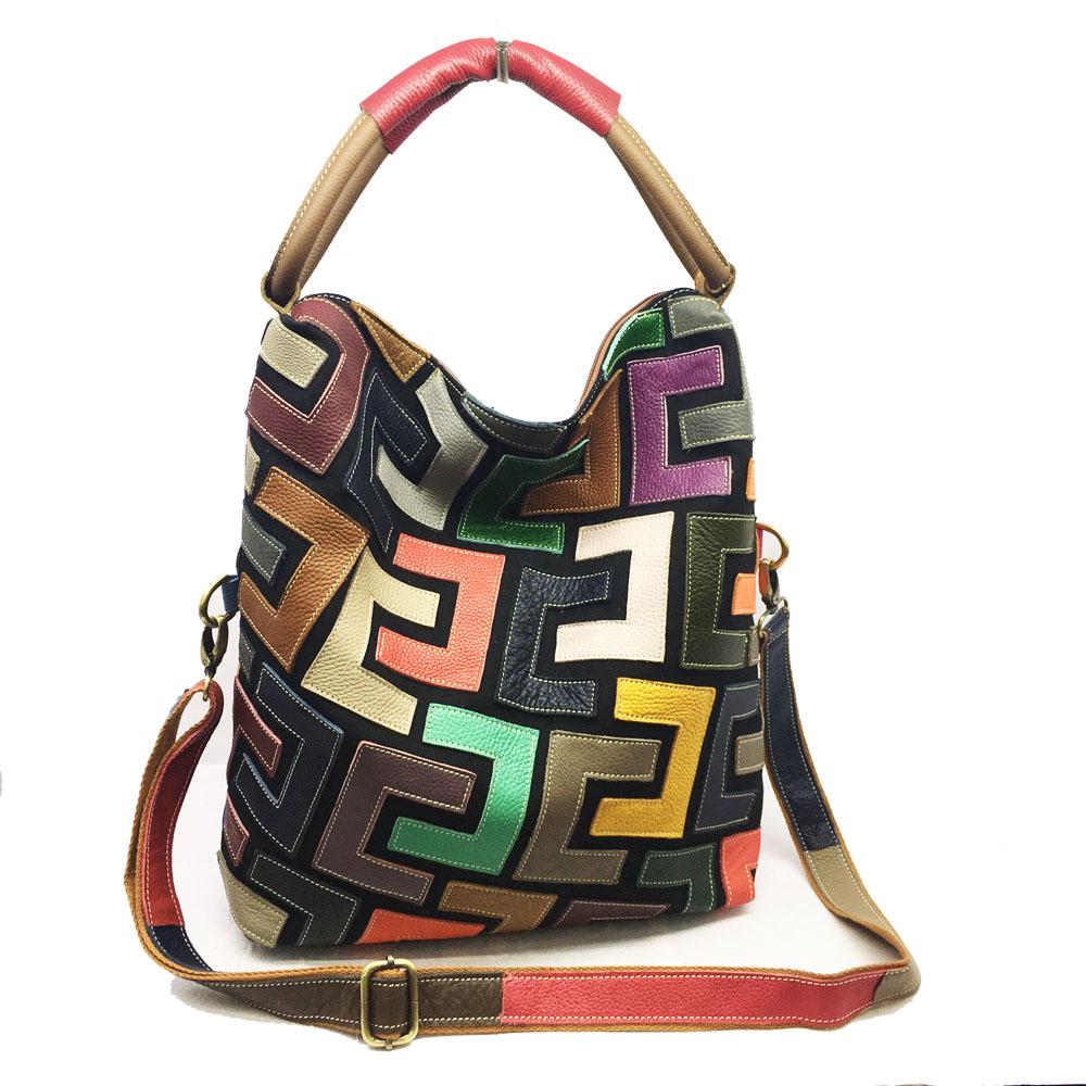 New Women's Bag, Color Blocked Leather Cowhide Shoulder Bag, Hand Stitched Graphic Shoulder Crossbody Bag, Women's Bag