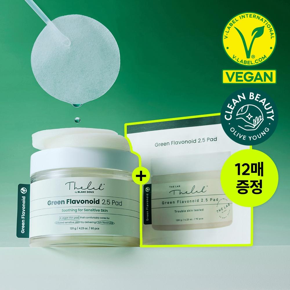 The Lab by Blanclab Green Flavonoid 2.5 Pad 90 Sheets Set (+12 sheets) is a double-speed vegan calming pad that soothes irritated sensitive skin. This product shows an effective relative calming improvement rate of 204% compared to untreated areas immediately after one use. It contains calming components from immature fruits and green tangerines, along with 2.5% Eosidin. The highly adherent pads fit softly to the skin and have passed suitability tests for acne-prone skin. It has an environmentally friendly capacity of 120g / 90 sheets and is a vegan product. The Green Flavonoid line is designed to care for irritated sensitive skin in a calm and healthy manner.