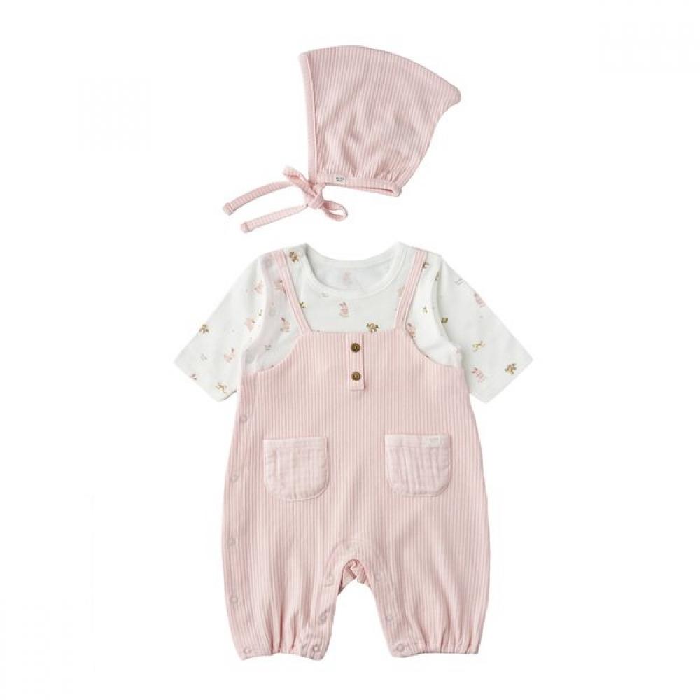 This is an all-in-one overall style spacesuit and hat set item that is easy to close. The combination of bamboo ribbed material and lyocell spandex material has good elasticity and is comfortable to wear for active babies. The design matches the cute Lulu character pattern and pink color scheme, making it an easy item to give to babies.