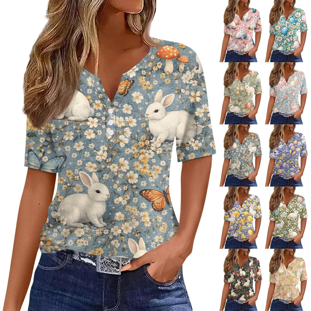 Tricou damă, tricou cu imprimeu, nasturi, mânecă scurtă, tunică, modă zilnică de weekend, top simplu cu decolteu în V, stil regulat