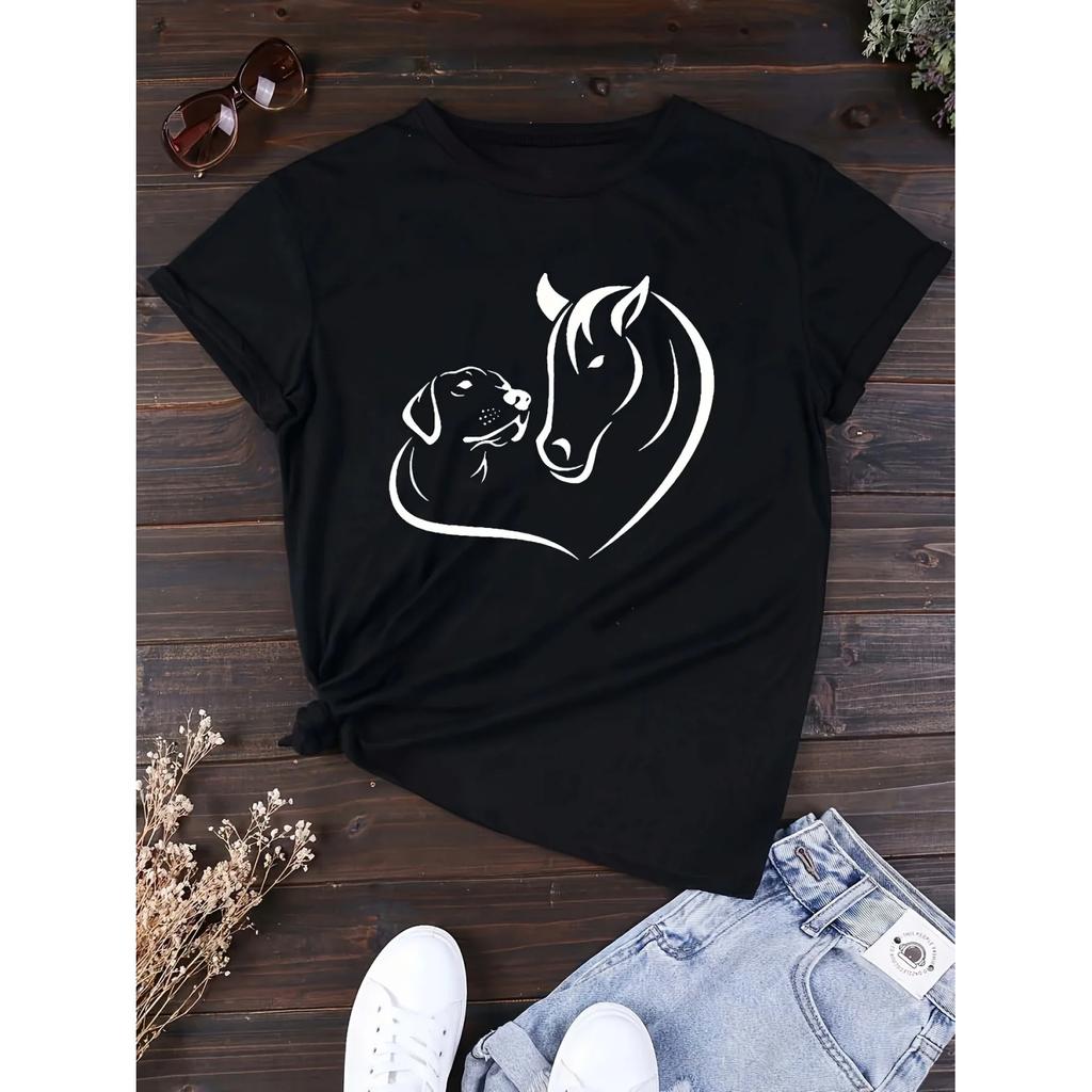 Horse & Dog Print T-Shirt, Casual Crew Neck Short Sleeve Top For Spring & Summer, Women's Clothing