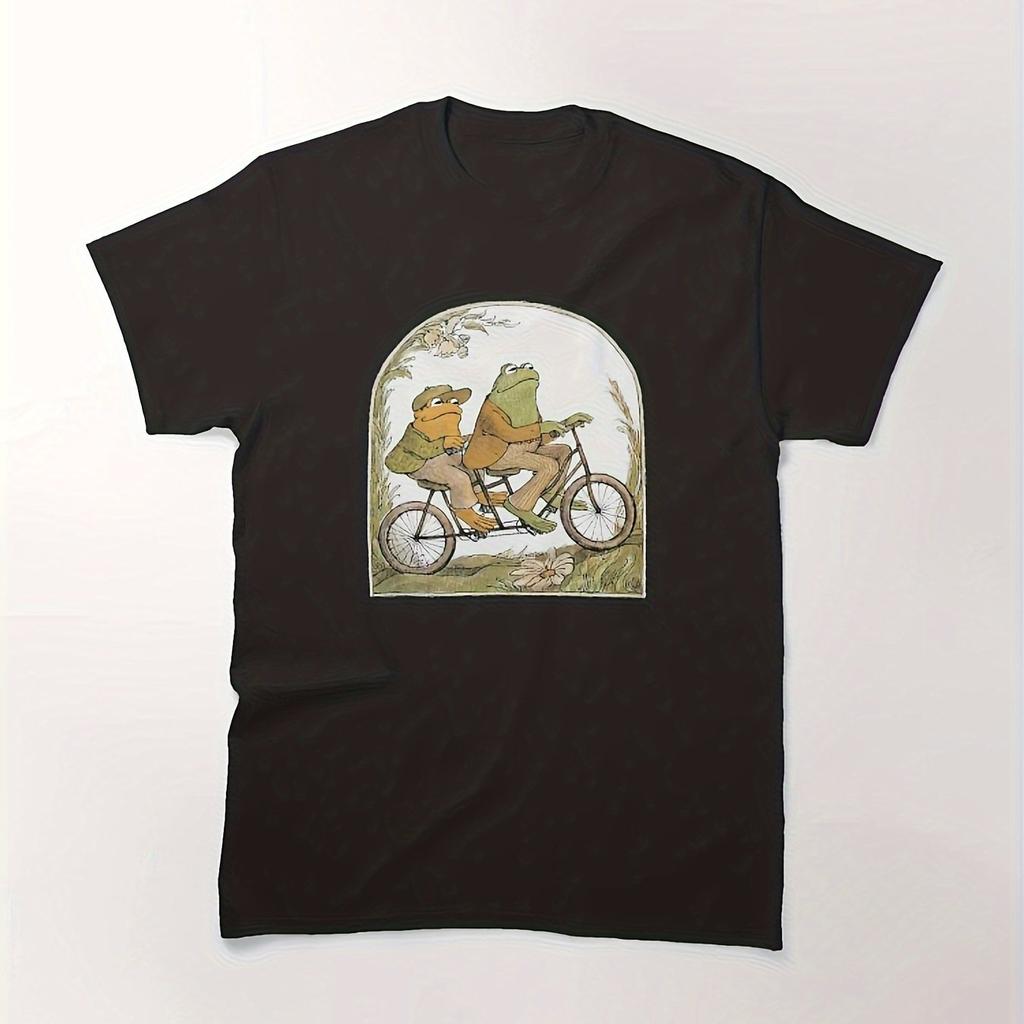 Frog and Toad Riding Bicycle Graphic Tee Men Cotton Casual Short Sleeve TShirt Funny Cartoon Print Unisex