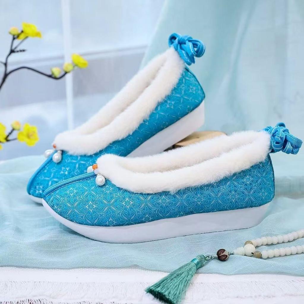 Women's Ethnic Style Shallow Flat sole Cotton Shoes Winter New Plush Keep Warm Ankle Strap Hanfu Shoes Cloud Ascending Shoes
