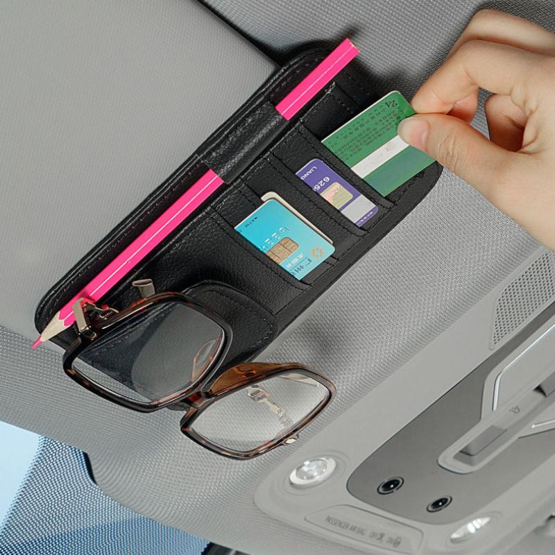 Car Sun Visor Organizer PU Leather Car Document Storage Pouch Pen Holder Multi-Pocket Sunglasses Clip Auto Interior Accessories