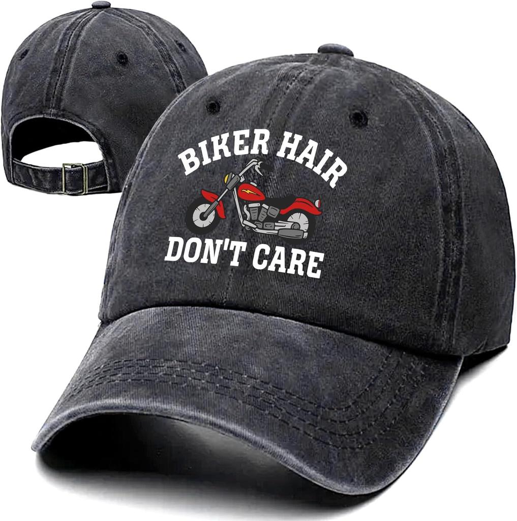 Biker Hair Dont Care Motorcycle Graphic Baseball Cap Washed Denim Style Adjustable Outdoor Sun Hat for Adult Bikers