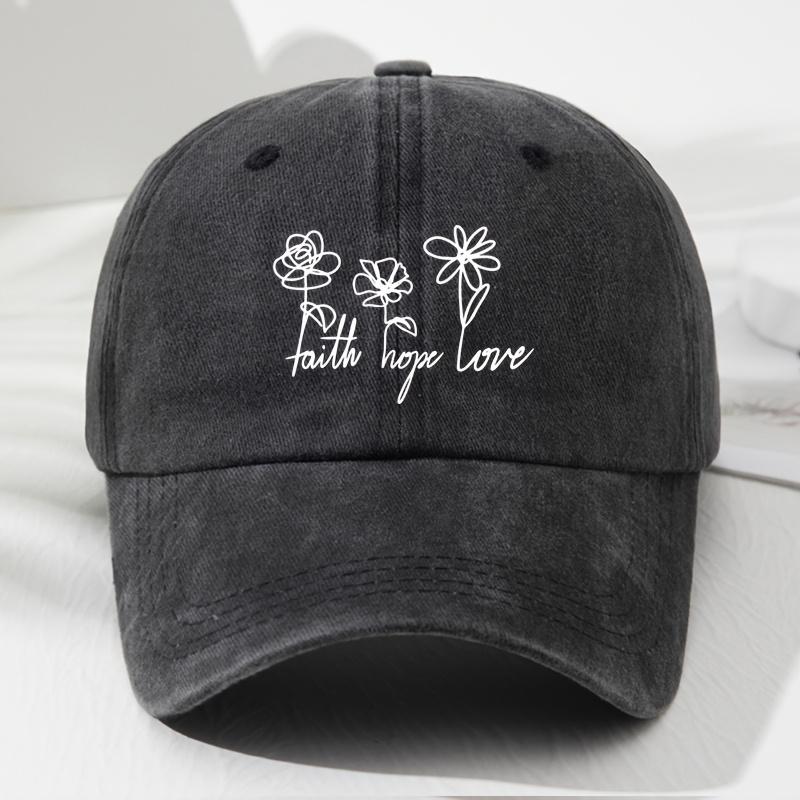 Unisex Adjustable Soft Top Baseball Cap with Floral Design Faith Hope Love Embroidery Lightweight Polyester