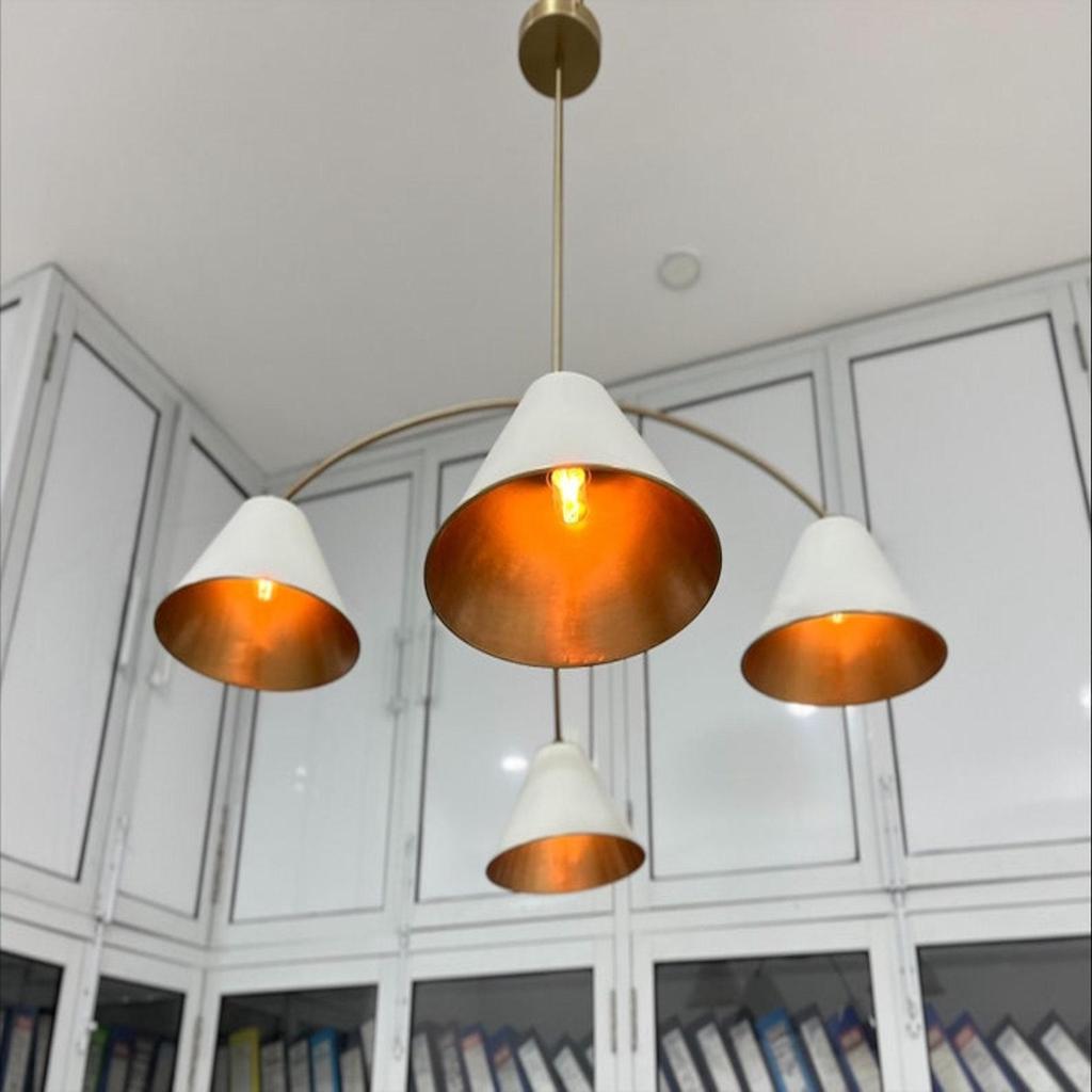 Candelabru Stilnova Sputnik cu 4 abajururi, din alamă brută de la mijlocul secolului, cu candelabre alb-gălbui