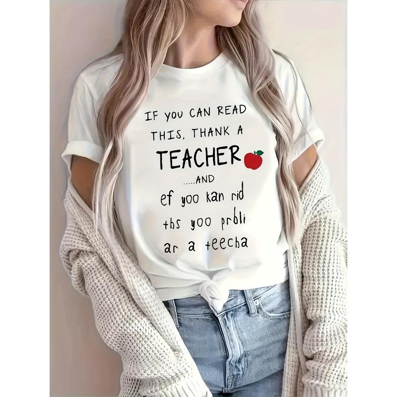 Women's Casual Short Sleeve Crew Neck T-Shirt Alphabet Print Polyester Knit Top
