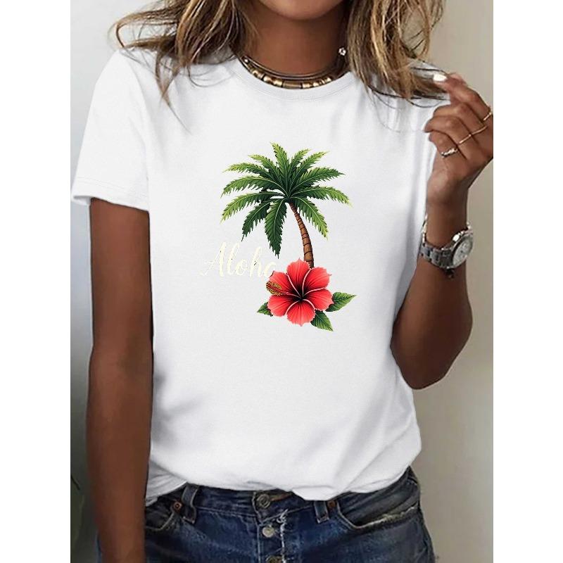 European Size Women's Hawaiian Aloha T-Shirt Short Sleeve Round Neck Blouse with Hibiscus & Palm Tree Print -Casual Summer Beachwear Top,Casual Attire