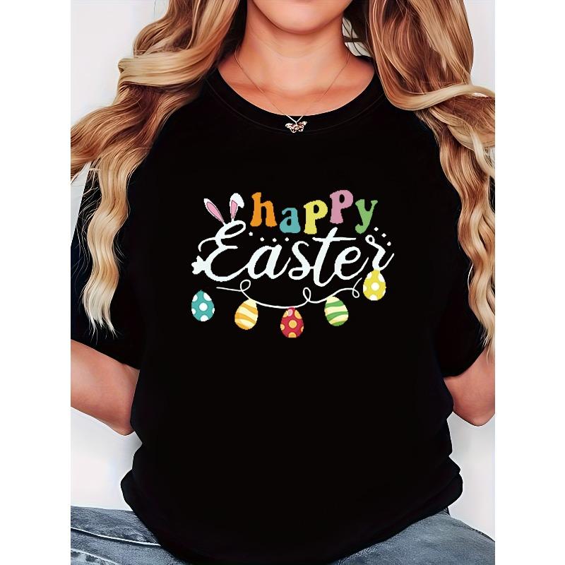 Women's Happy Easter Print T-Shirt Black Casual Short Sleeve Round Neck Spring Top