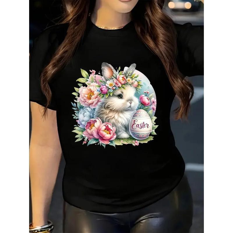 Womens Easter Bunny Floral Print T Shirt Soft Round Neck Short Sleeve Casual Spring Summer Top Easter Holiday Gift Casual Attire Holiday