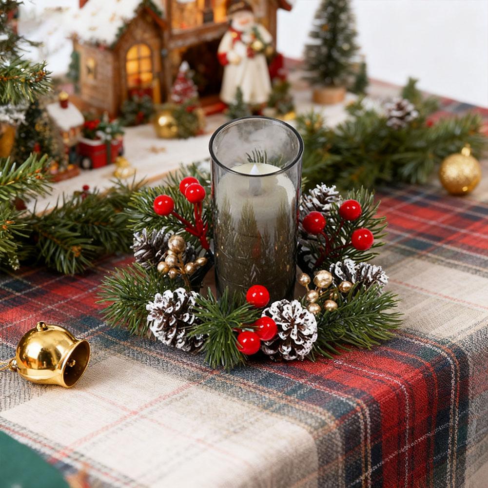 Christmas Candle Rings Wreaths Artificial Norfolk Pine Branches Red Berry Branch Candle Holder Rings Decoration for Centerpieces