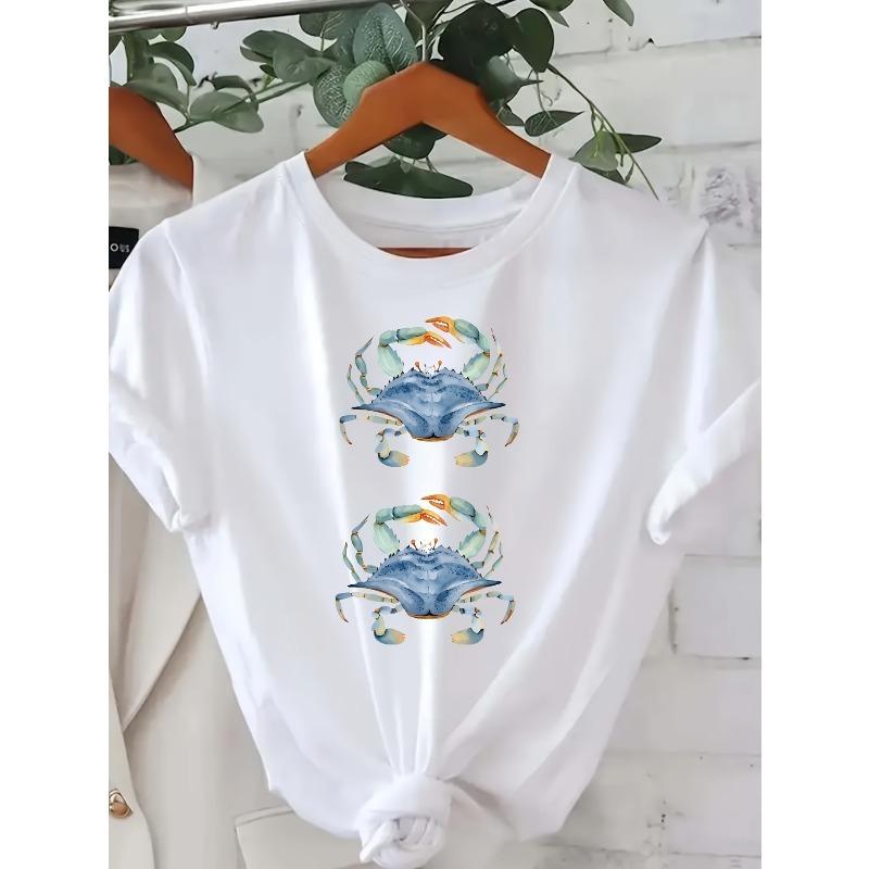 European size 1pc Women'S Crab Print T-Shirt | Comfortable Casual Short Sleeve Crew Neck T-Shirt, Suitable for Daily Wear and Fashion Matching
