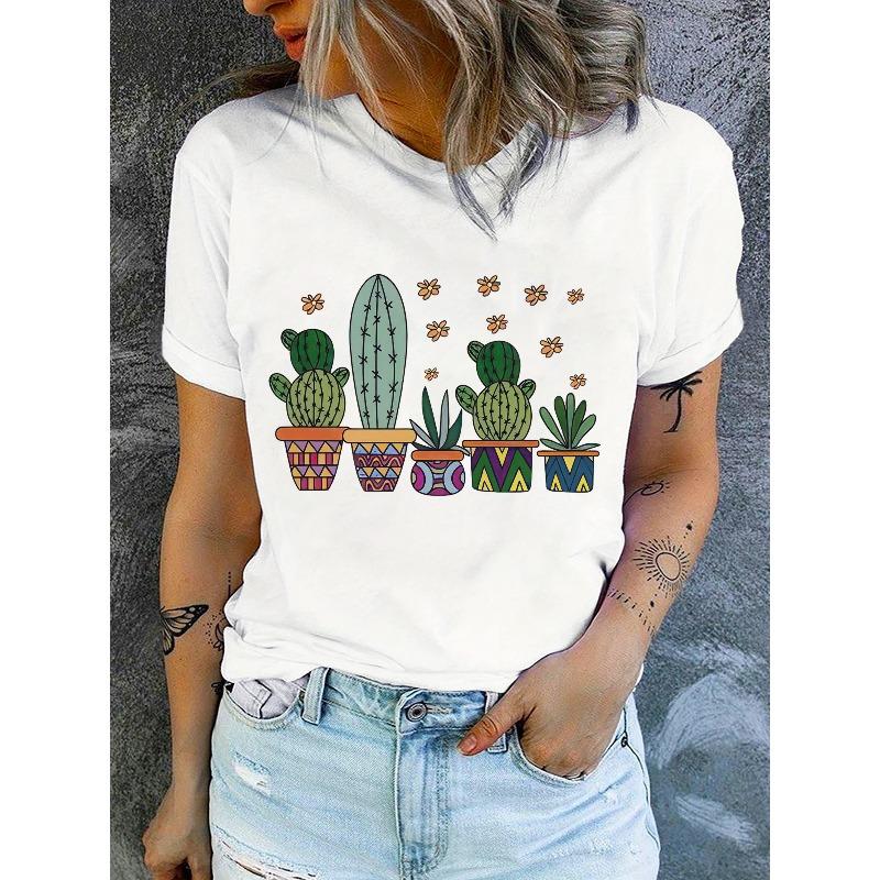 European Size Women's Cactus Graphic Print T-Shirt - Casual Crew Neck Short Sleeve Tee with Color Block Design - Polyester