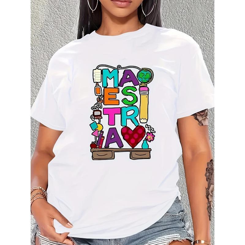 European size Graphic Print T-shirt, Casual Crew Neck Short Sleeve Top For Spring & Summer, Women's Clothing