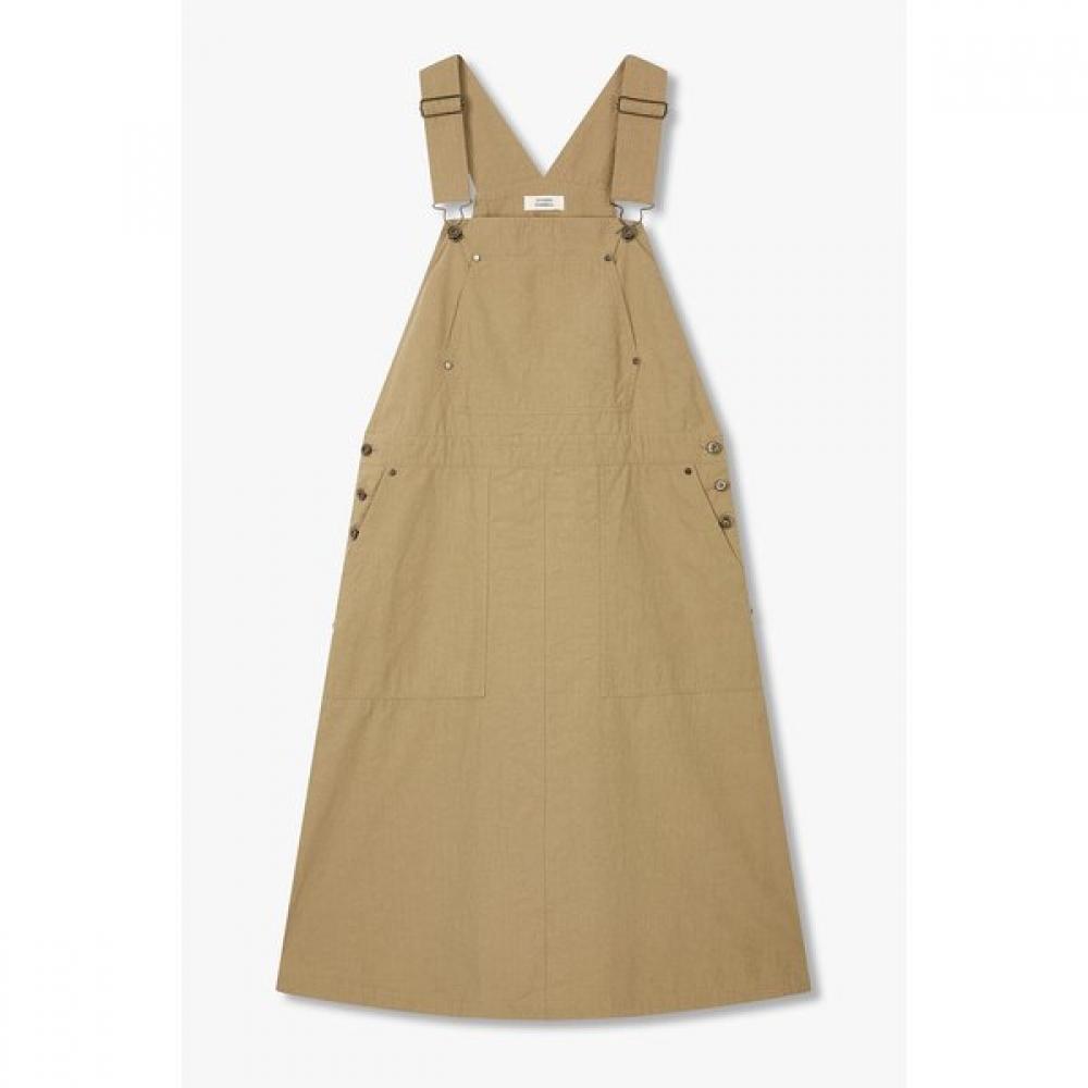 The Overalls Cargo Dress features a design that incorporates a workwear mood, with shoulder strap details and dimensional pocket placements that enhance its casual feel. The front is minimal while the back adds interest with pocket design, creating an attractive aesthetic from both the front and back. It's a practical item that can be layered with T-shirts or knits throughout the seasons.