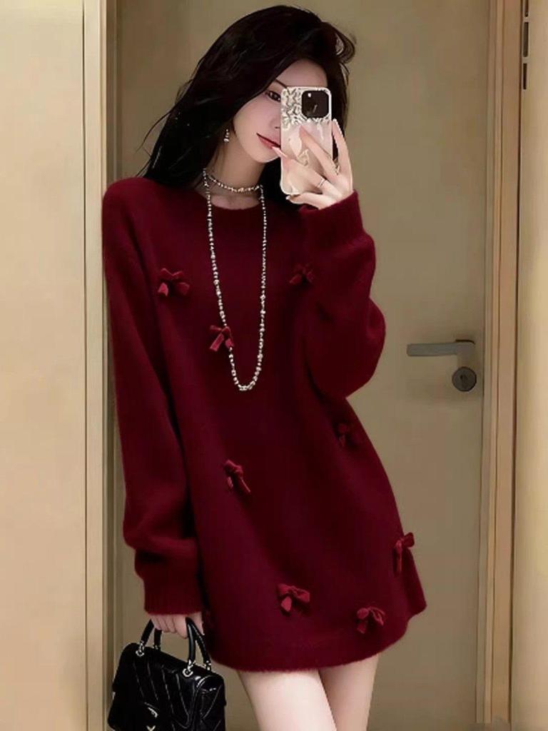 Women's Red Bow Knit Dress - Autumn/Winter Outerwear, Loose Fit, Mid-Length, Lazy Style Base Layer, Knitted Short Skirt