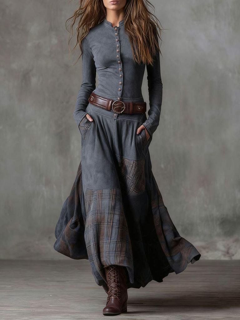Elevate your wardrobe with this chic patchwork skirt dress, designed for the modern commuter. Crafted from luxurious suede and durable polyester, it offers a unique plaid pattern that adds a touch of sophistication to your ensemble. The dress features convenient pockets and a stylish button belt, combining practicality with elegance. Perfect for both professional settings and casual outings, this versatile piece promises comfort and style throughout your day.
