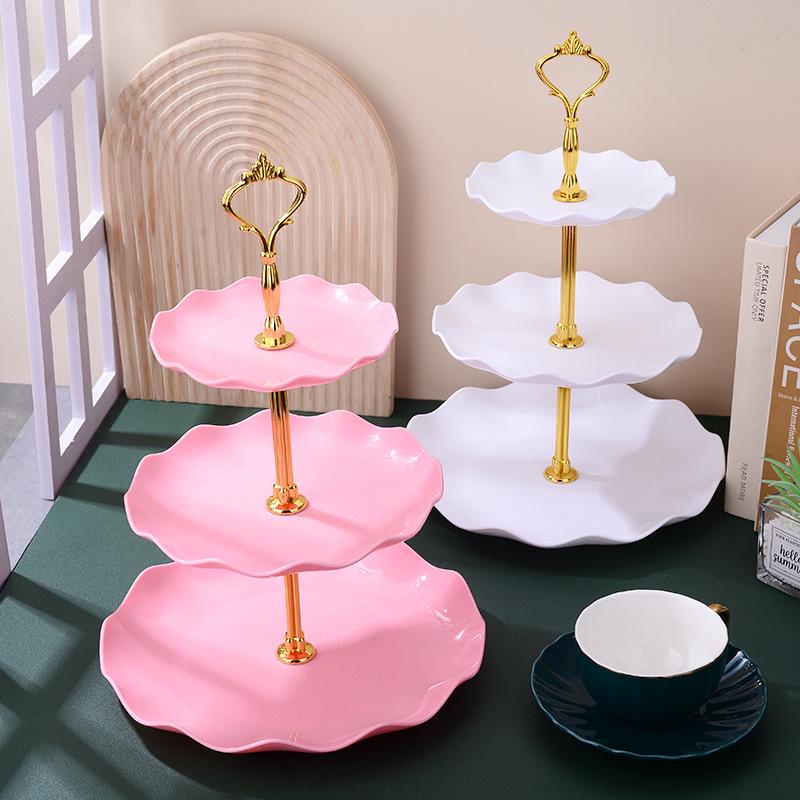 Suport de desert cu trei etaje în stil european: Placă de Fructe și Suport pentru Prăjituri din Plastic pentru Petreceri și Nunți