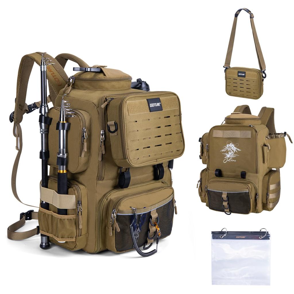 Goture Fishing Backpack, 58L Large Capacity, 900D Oxford Fabric with Water-Repellent Finish, Detachable Shoulder Bag, Expandable Clear Storage Pouch,