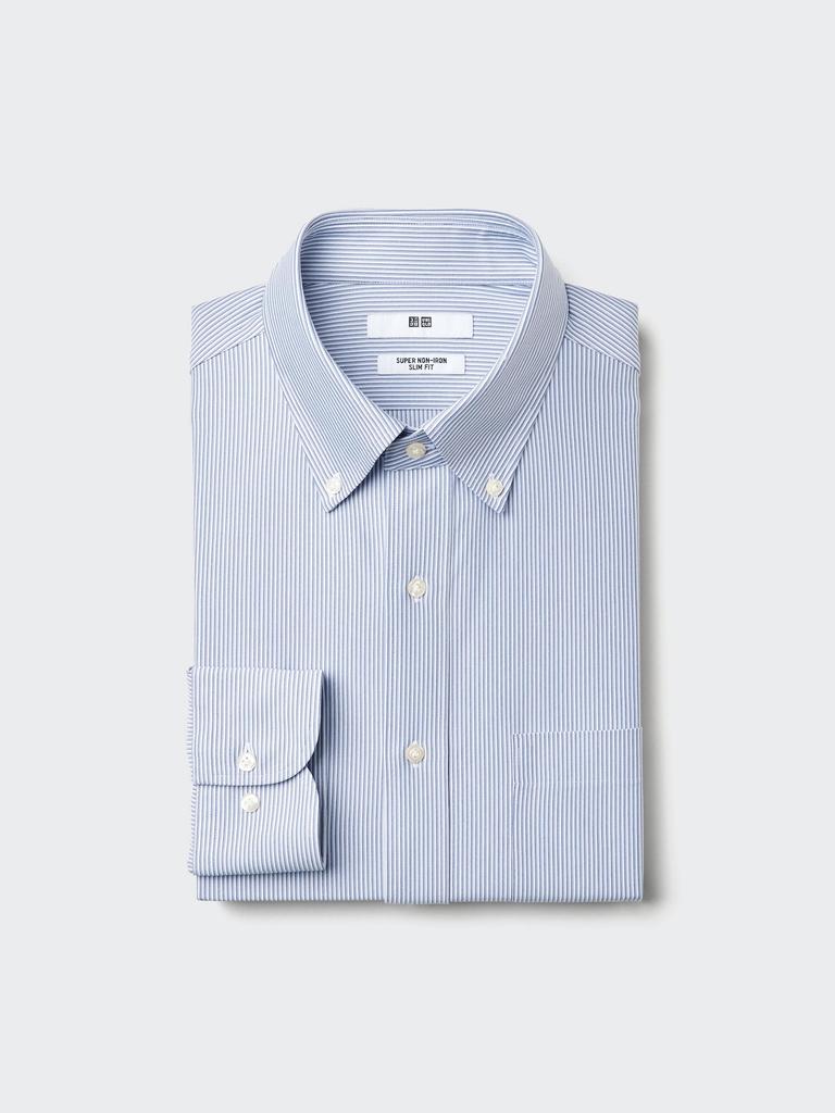 The UNIQLO JAPAN Super Non-Iron Jersey Slim Shirt is made from a thin fabric that gives a luxurious feel, boasting a natural luster and comfortable fit. The button-down design and striped pattern complete a sophisticated style.