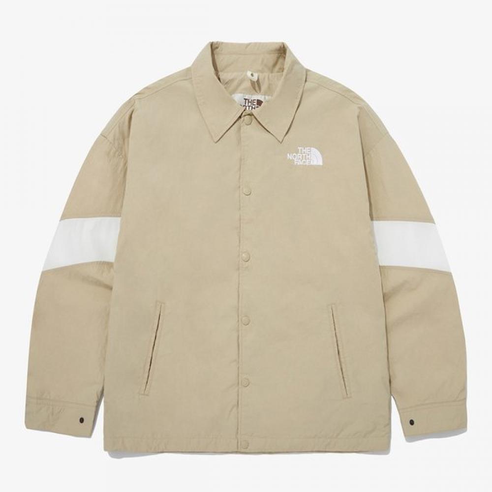 The North Face White Label Olema Coach Jacket NJ3BQ04K is a basic design outdoor jacket suitable for the transitional period. Made from a single-layer woven fabric, it is comfortable for spring to early summer and suitable for light sports activities or daily wear. The jacket features a natural appearance with a cotton-like touch made from nylon taslan fabric, and has hydrophobic treatment providing lightweight water-resistant functionality. It is equipped with a 2-way zipper and has elastic band detail at the sleeves and hem for a natural fit.