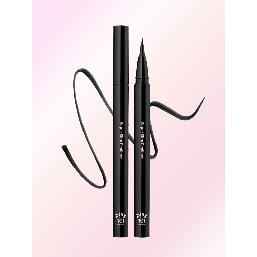 Play101 by Etude [01 Black] Super Slim Proof Pen Liner is a 1.5mm ultra-slim pencil liner that delicately fills in the lash line and waterline with a fine pencil that mimics a pen, achieving a natural and clear eye look. While it is thin, it allows for easy application of defined eyeliner, and the emulsion film polymer formula is resistant to moisture and oil, maintaining a vibrant point makeup throughout the day.